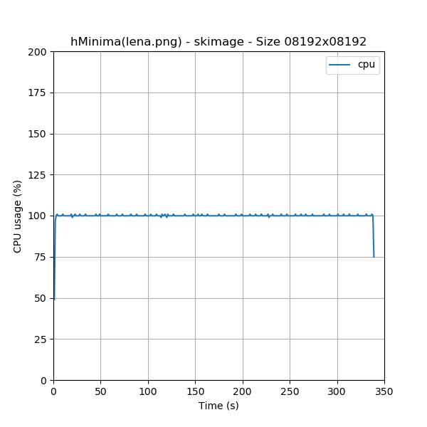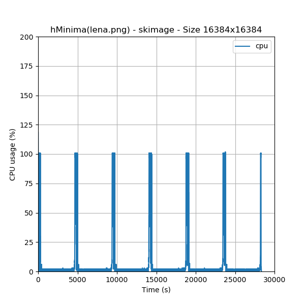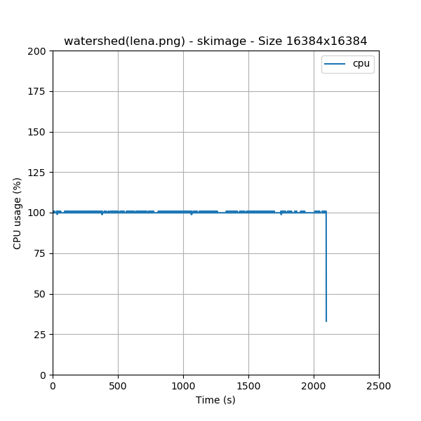 As explained in the [methodology.html#resources-measurements methodology page], we weren’t able to run this test on the nestor computer with skimage library because the available memory (16 GiB RAM) limit was reached and the process begun to swap. So we decided to run this test also with an image size four times smaller (8192x8192).